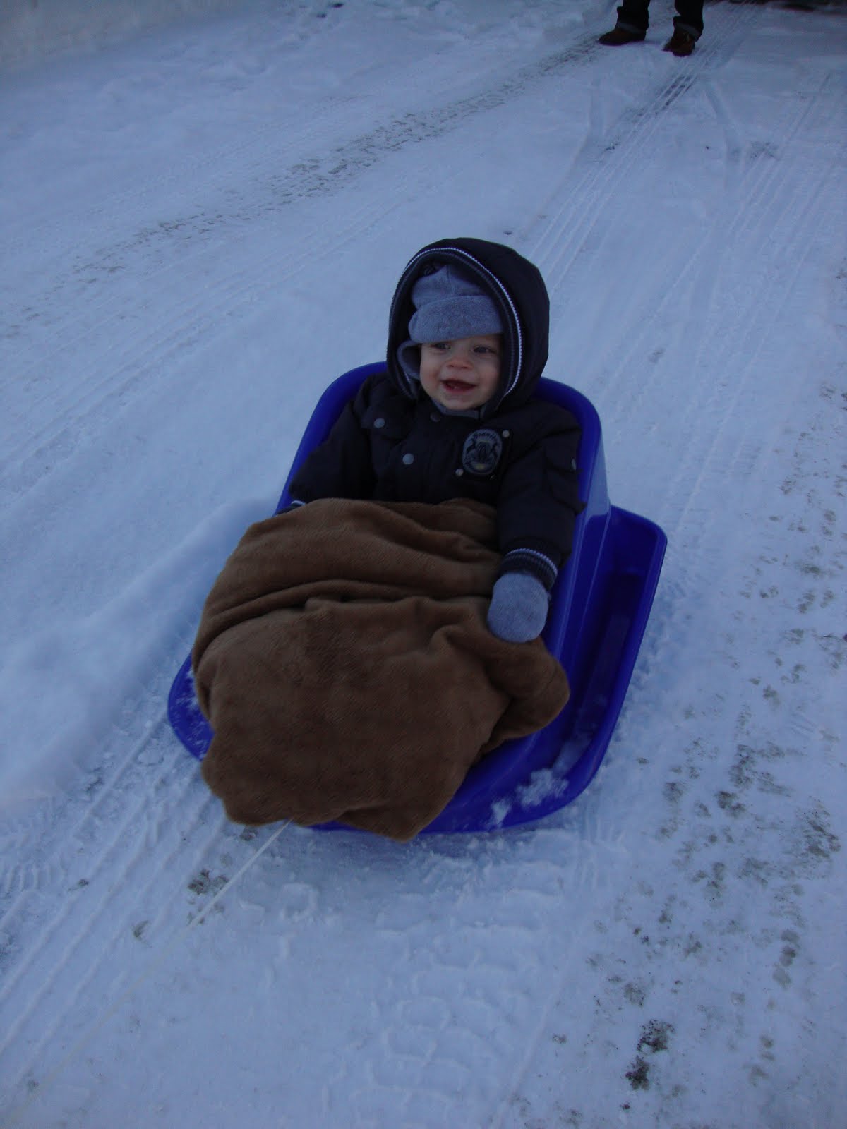In SO many layers! He looked like the kid from The Christmas Story. Leggings, pants, onesie, sweater, coat, hat, socks, boots, mittens, blanket...his little nose was cold, but the rest of him was roasty toasty.