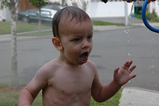 This picture makes me smile for so many reasons. You can see his drenched with water pouring off his face. His belly button...enough said. And you can see his latest little quirk, the crossed fingers. The past couple of weeks he has been crossing his fingers on his right hand. I'm not sure what that's about, but I think it's really sweet.